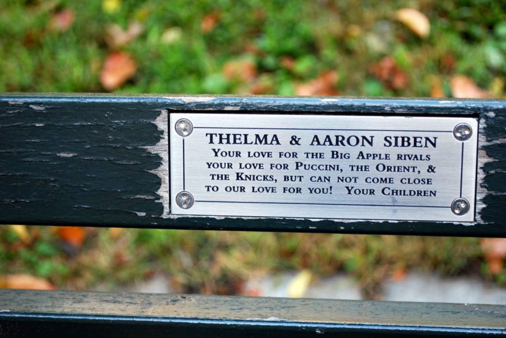 Der Central Park bietet die Möglichkeit eine Parkbank zu ‚adoptieren‘ und ein Schild mit Wunschtext darauf zu montieren. Man muss dem Park ein Minimum von $ 10.000 Dollar dafür spenden.