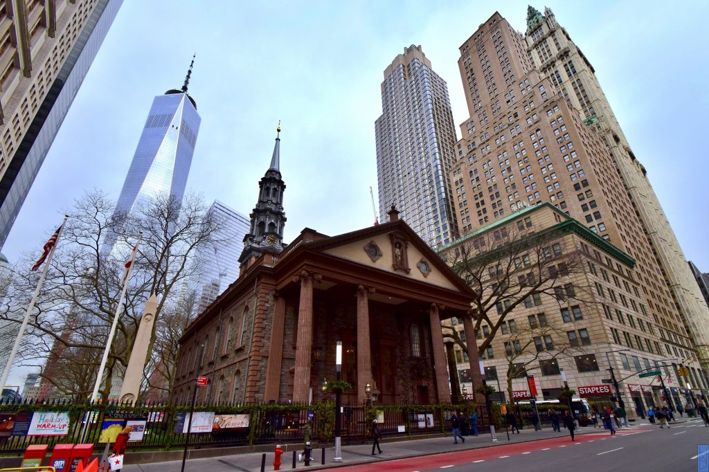 St. Paul’s Chapel an der Ecke Broadway und Fulton Street wurde 1764 für Anhänger der Church of England gebaut und ist das älteste, durchgehend benutzte Gebäude in New York.