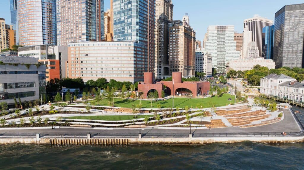 Im 1,4 Hektar großen Robert F. Wagner Park in Battery Park City an der Südspitze Manhattans wurde ein neuer, öffentlich zugänglicher Wagner Park Pavillon mit Dachterrasse eröffnet. Er bietet einen