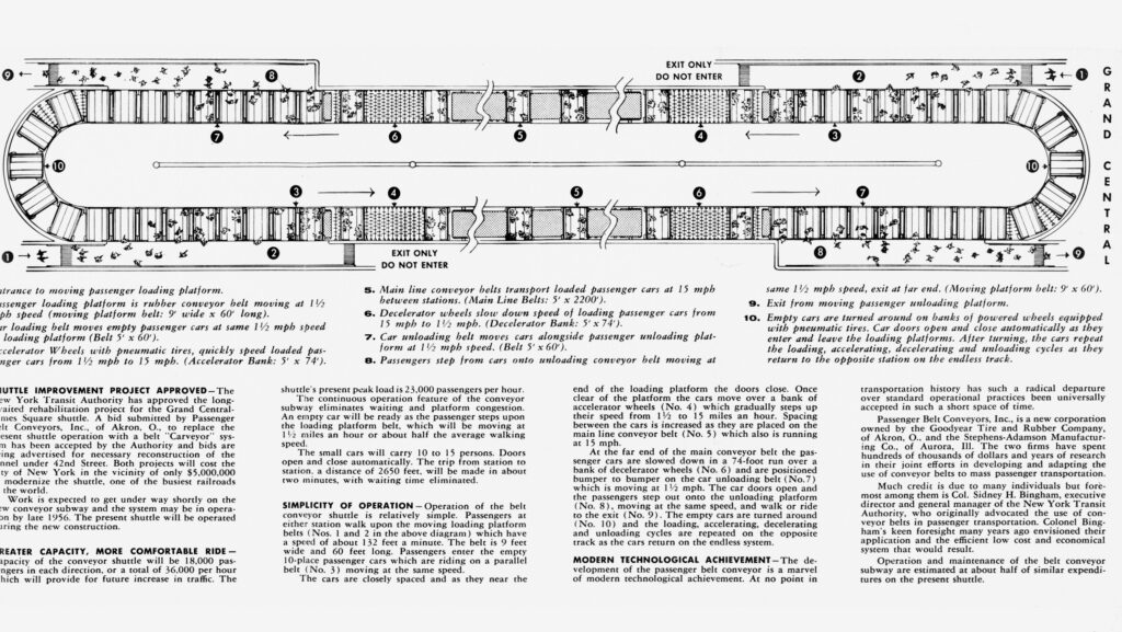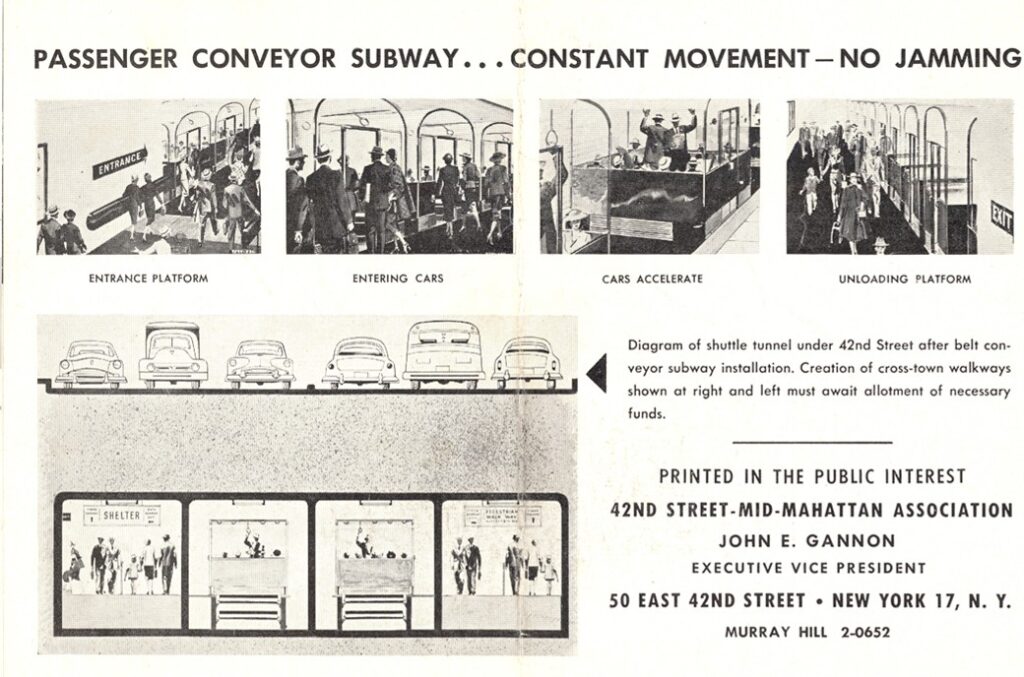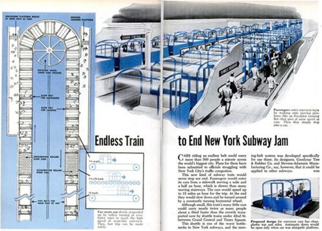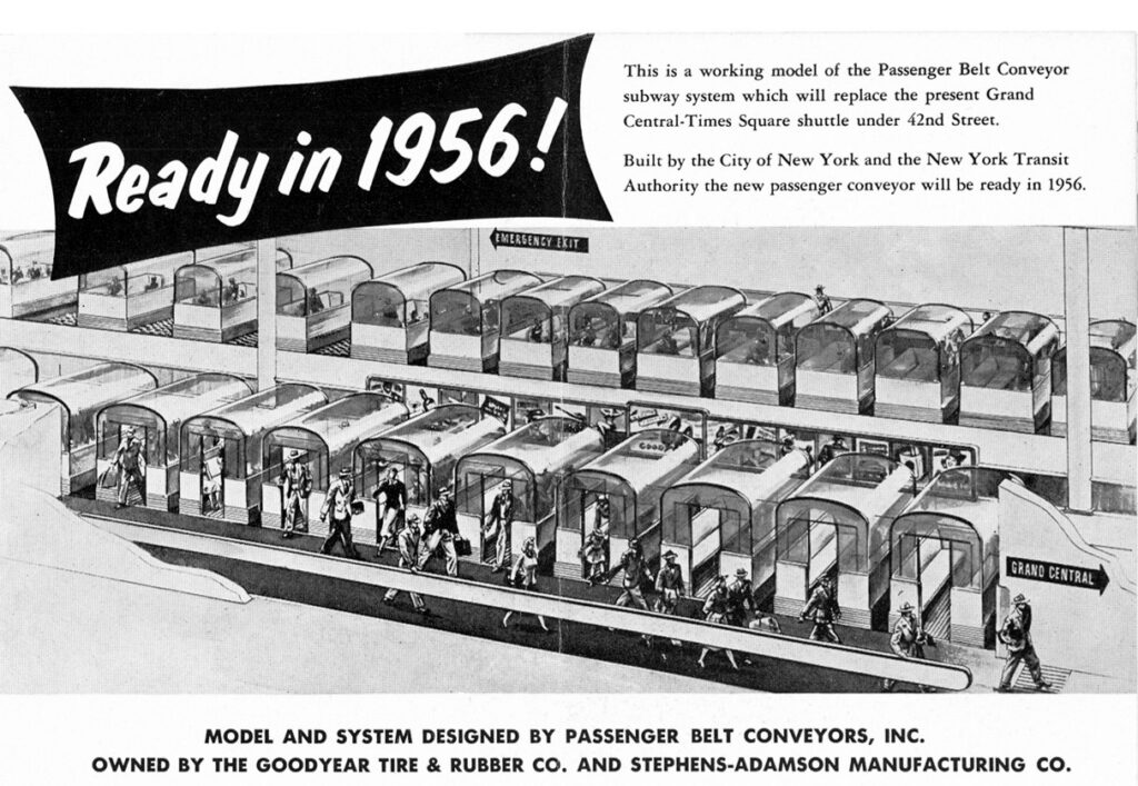 1951 schlug die ‘Goodyear Tire and Rubber Company‘ vor, ein ‘Förderband‘ für den Transport von Menschen mitten durch Manhattan zu bauen. Gondelähnliche Wagen sollten täglich 60.000 Passagiere in einer endlosen Schleife zwischen der Grand Central Station und dem Times Square befördern. Man wolle so helfen, das Stauproblem zwischen den zwei wichtigen Knotenpunkte im Herzen New Yorks zu lindern.