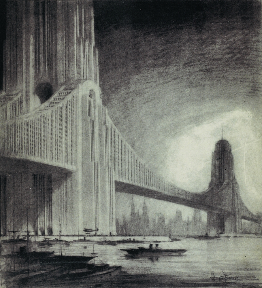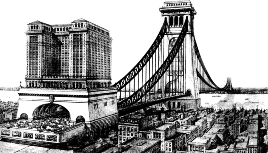 Bis um 1925 herum hatte New York London den Rang als größte und am dichtest besiedelte Stadt der Welt abgelaufen. Der renommierte Architekt Raymond Hood kam in dieser Zeit auf eine Idee platzsparender zu bauen. Er wollte Brücken mit Wolkenkratzern kombinieren. Diese ‘Skyscraper Bridges‘ sollten allen zu der Zeit bekannten Komfort bieten, beispielsweise Shops und Theater. Hoods Pläne sahen auch vor, dass sich Aufzüge direkt zum jeweiligen Fluss öffnen würden, auch damit Wassersport betrieben werden konnte. Der Architekt wollte mindestens zwölf solcher Wolkenkratzerbrücken bauen.