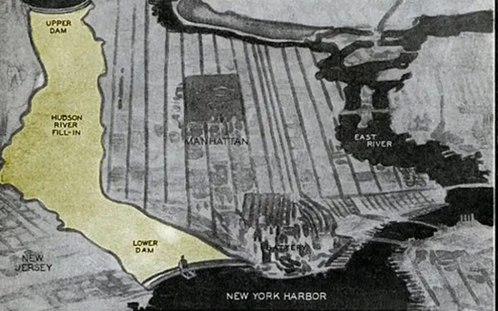 1934 veröffentlichte Norman Sper, Professor für Ingenieurwesen, im beliebten Magazin Modern Mechanix, einen viel beachteten Plan zur „Aufschüttung des Hudson Rivers an beiden Enden Manhattans“, der die Fläche der Insel um satte 40% vergrößert hätte.