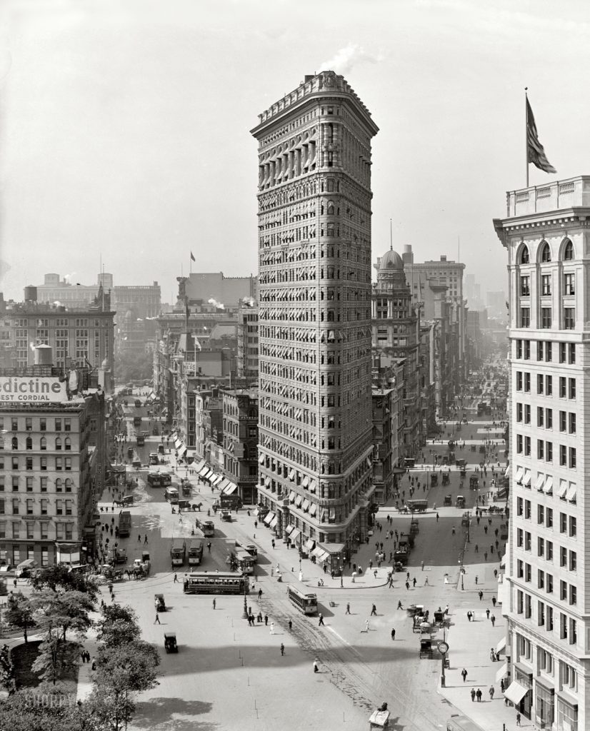 Das 1902 fertiggestellte Flatiron Building ist eine Ikone New Yorks. Vielerorts gilt es aufgrund der in der Bauzeit 1899 bis 1902 neu entwickelten Stahlgerüstkonstruktion sogar als erster Wolkenkratzer der Stadt, obwohl die Höhe von 87 Meter für heutige Verhältnisse natürlich bescheiden ist.