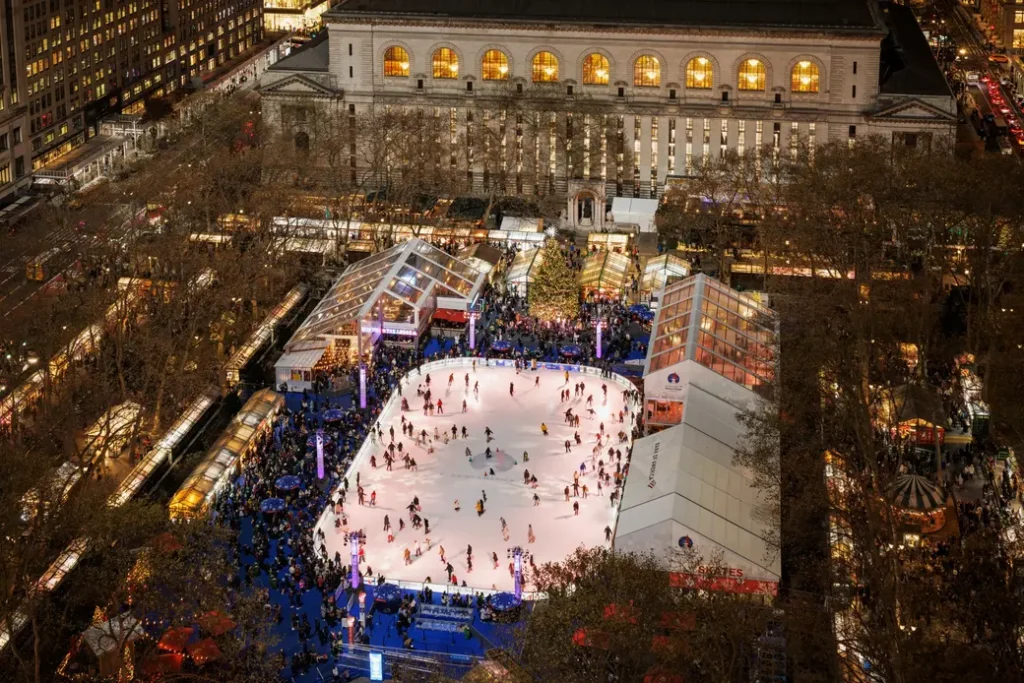 Mitten im Bryant Park, umgeben von spektakulärer Kulisse, befindet sich die einzige kostenlose Schlittschuhbahn New Yorks. (Für den Schlittschuhverleih wird allerdings eine Gebühr erhoben.)