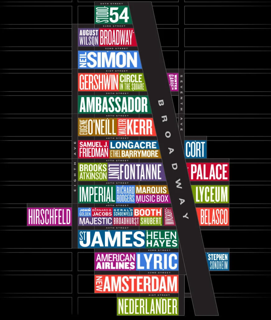 Um als Broadway Theater zu gelten, muss man nicht auf dem Broadway selbst sein. Die meisten Theater sind in den Seitenstraßen. Hier eine Karte mit den Theatern, die am oder um den Broadway herum zwischen der 54th und 41st Street liegen.