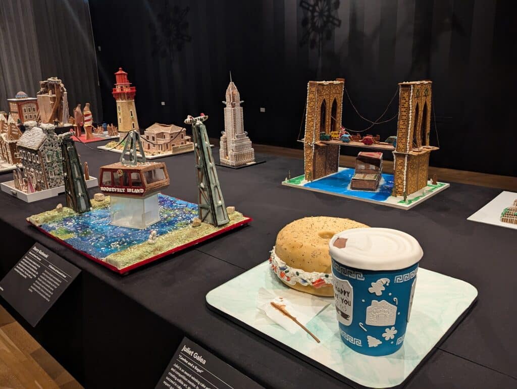 Nicht nur Wahrzeichen wie die Brooklyn Bridge, die Freiheitsstatue und das Chrysler Building sind ausgestellt, auch ganz andere Objekte, die die Stadt ausmachen, kann man in Lebkuchenform bewundern. Darunter die U-Bahn, Staten Island Ferry, Roosevelt Island Seilbahn und New York Ikonen wie ein Bagel oder einen Wassertank, wie er auf Hausdächern steht.