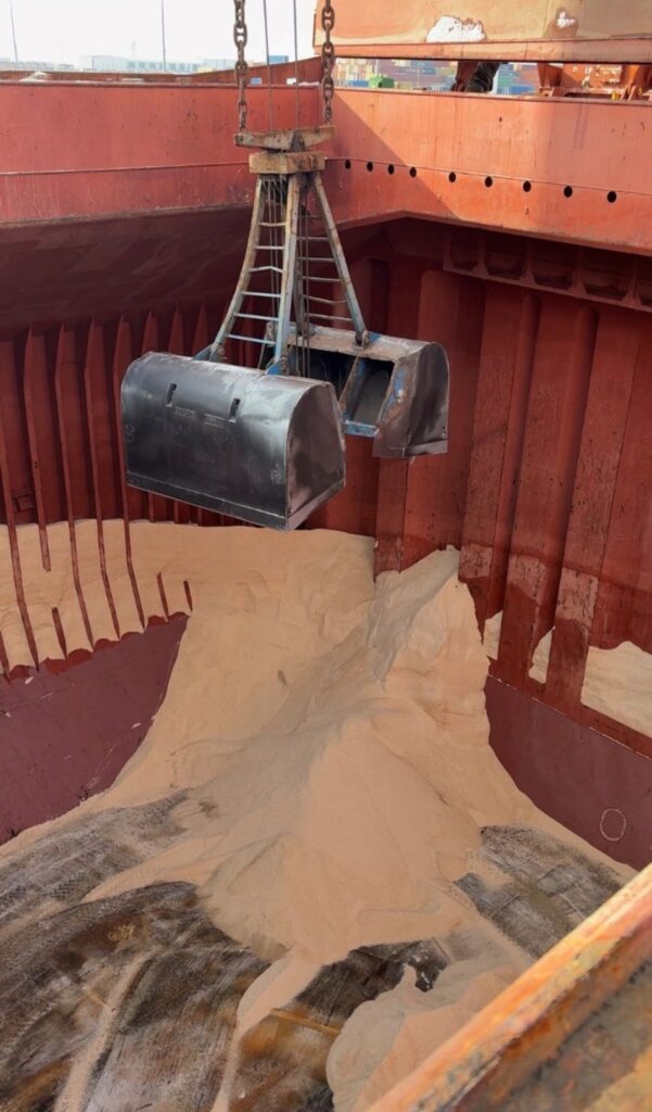 Die Überfahrt dauert zwei bis vier Wochen. Sobald das Massengutschiff eintrifft, verlagert sich der Betrieb von global auf lokal. Das Salz wird vom Schiff entladen, teilweise mithilfe von Kränen, die direkt auf dem Seeschiff montiert sind, und in einen trichterförmigen Behälter am Kai gekippt. Ein kontinuierlicher Strom von Lkw parkt unter dem Behälter, nimmt die Ladung entgegen und entlädt sie anschließend auf einem nahegelegenen Salzhaufen. Die drei Unternehmen verfügen im Hafen über Lagerkapazitäten für rund eine halbe Million Tonnen Salz.
