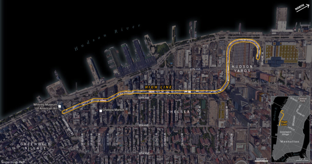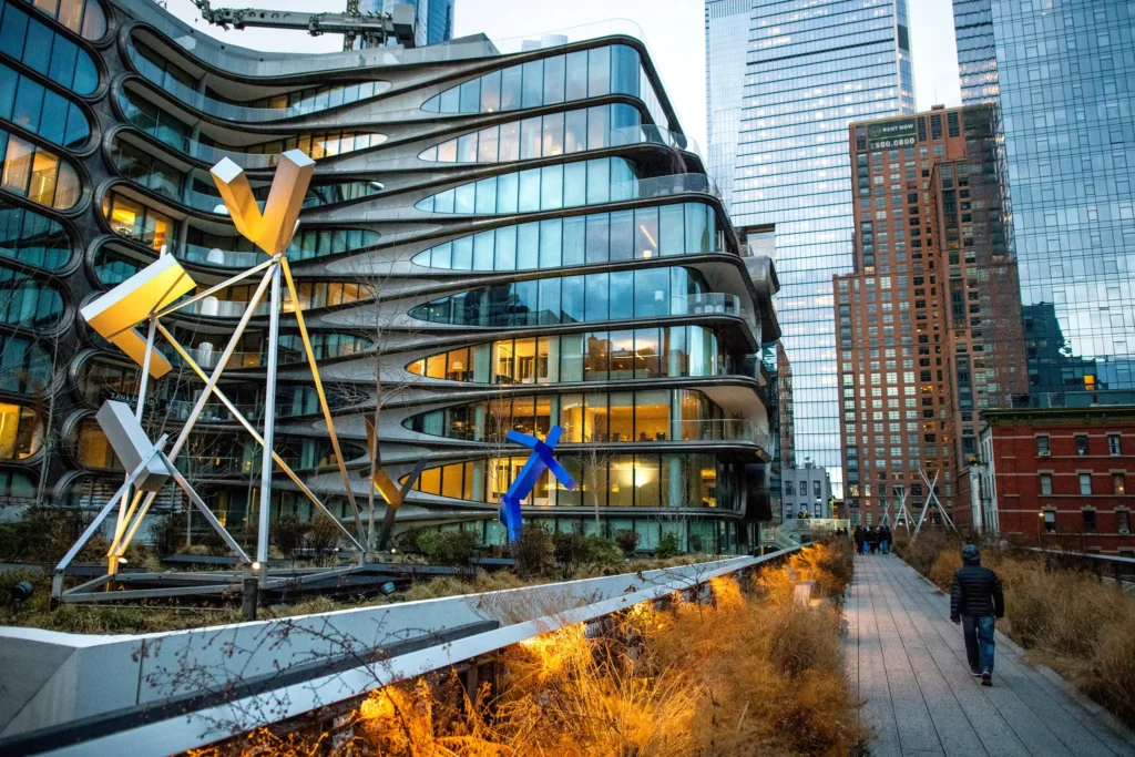 Alle Viertel, durch die die High Line läuft, der der Meatpacking District, Chelsea und die Hudson Yards sind heute teuren Szene-Viertel und gehören zu den begehrtesten Lagen in New York, bekannt für viel moderne Architektur.