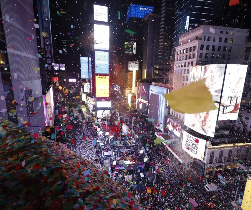 Am 31. Dezember versammeln sich Hunderttausende Menschen am Times Square, um das neue Jahr einzuläuten.  Um 23:59 Uhr sinkt eine schillernde Kugel (‚the Ball‘) an einer Stange auf dem Gebäude One Times Square herab, beobachtet von den Anwesenden und Millionen Menschen an Bildschirmen. Es wird von 60 heruntergezählt und um 00:00:00 Uhr am 1. Januar brechen die Menschen in Jubel aus, viele ziehen ihre(n) Liebste(n) zu einem Kuss an sich. (Wie diese Tradition entstand, können Sie hier lesen)
