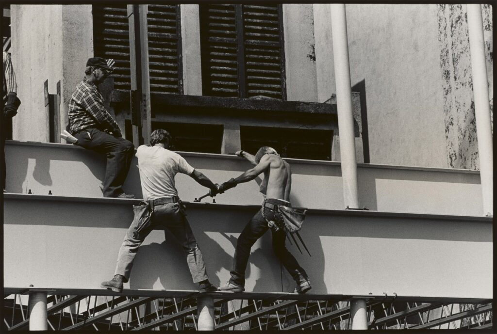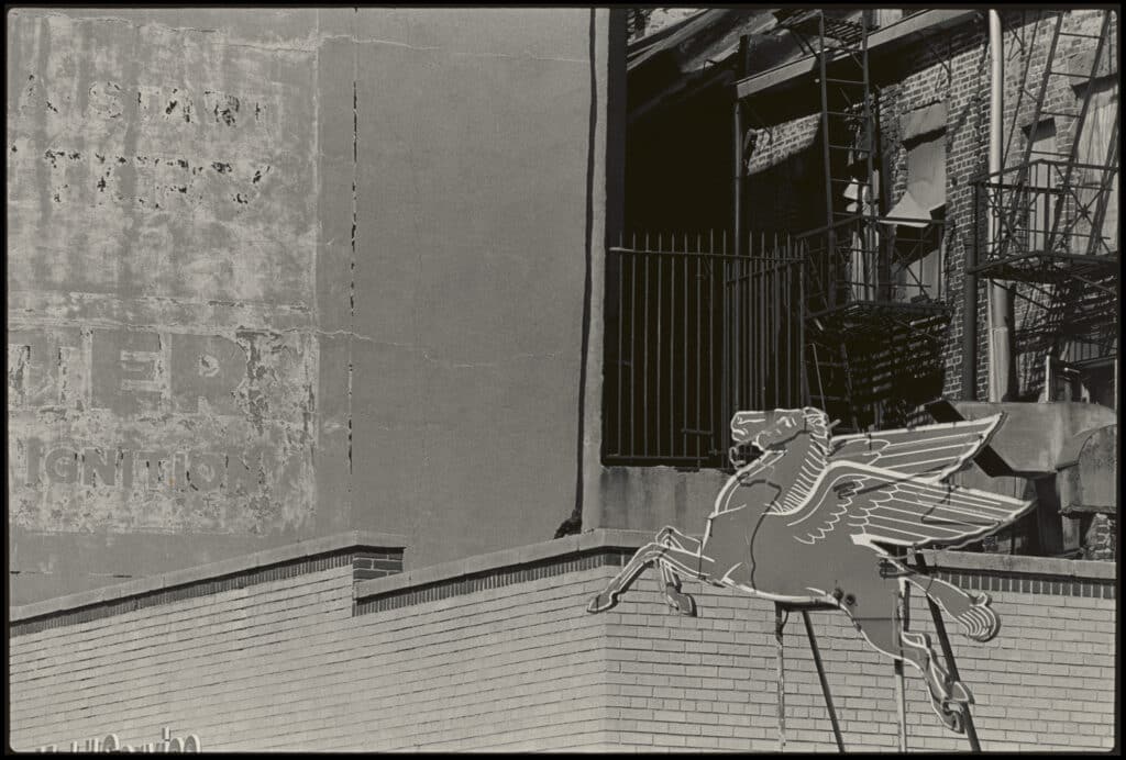New York ist in diesen Fotografien ein eigenständiger Charakter – verfallen, unruhig gefangen in einem Moment des Wandels. Viele der Bilder wirken wie Collagen und spiegeln die Technik der Gegenüberstellung wider, die man auch in Rauschenbergs Combines findet.