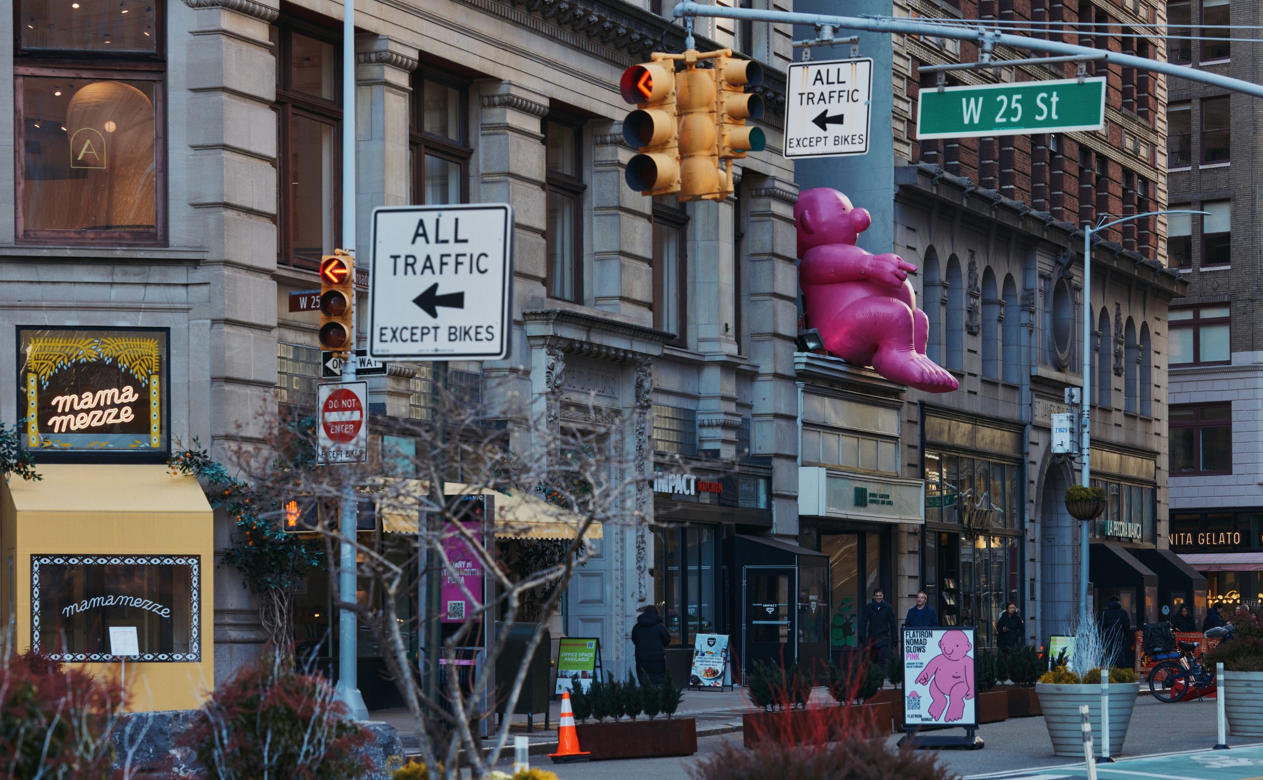 In der Gegend rund um das Flatiron Building sind jetzt 10 rosafarbene Männer zu sehen. Die beleuchteten aufblasbaren Skulpturen, die auf Dächern und öffentlichen Plätzen