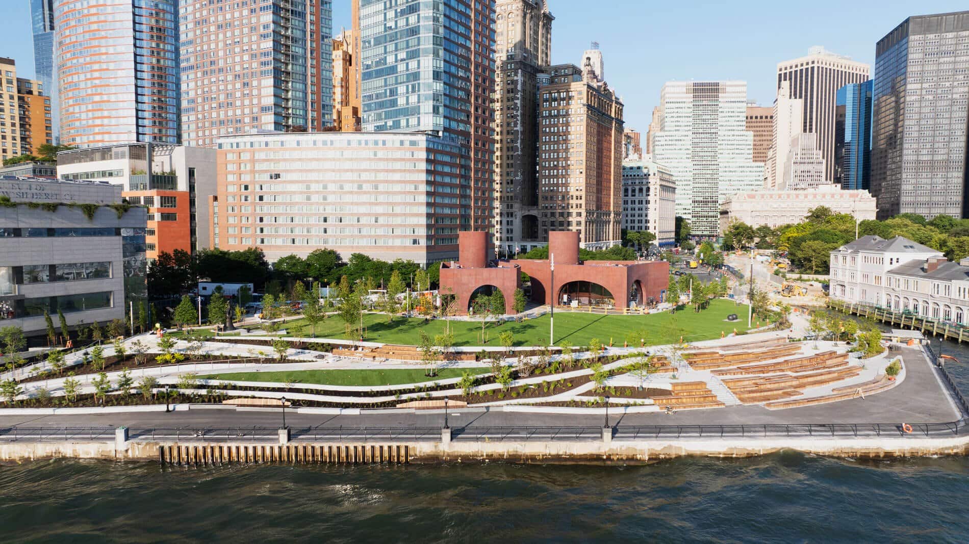 Im 1,4 Hektar großen Robert F. Wagner Park in Battery Park City an der Südspitze Manhattans wurde ein neuer, öffentlich zugänglicher Wagner Park Pavillon mit