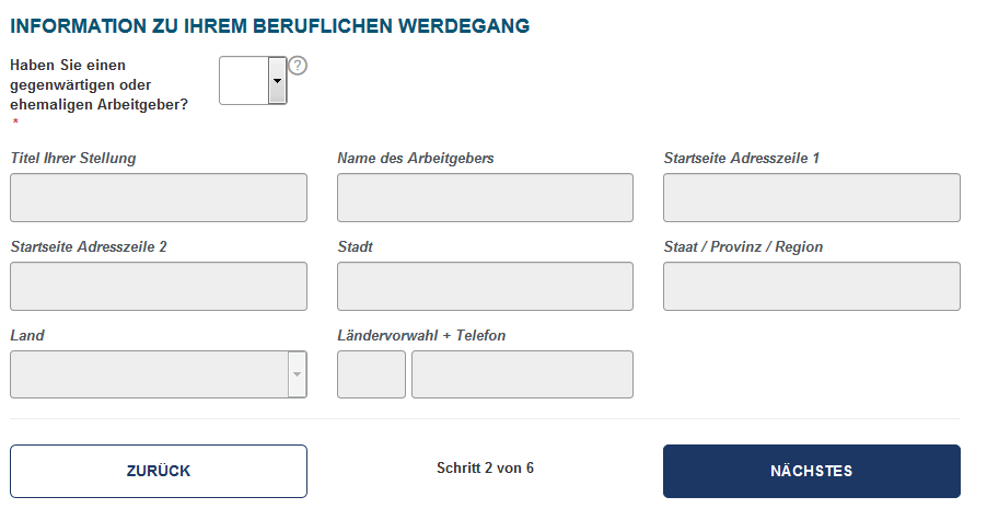 10-) Angaben zum Beruf, ‚Beruflicher Werdegang‘ genannt obwohl nur nach dem Arbeitgeber gefragt wird. Leute, die nicht in eine Arbeitsverhältnis stehen. können den letzten Arbeitgeber angeben.