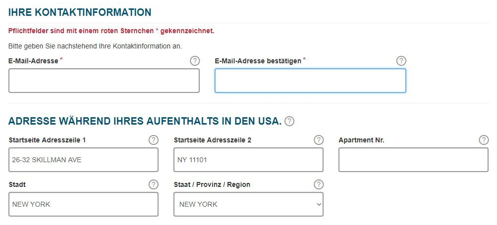 Zuerst wird gefragt, ob ihr die USA nur als Durchreiseland nutzt. Wenn Sie nicht nur einen Zwischenstopp an macht, um in ein anderes Land weiter zu reisen, mit „Nein“ antworten. Danach wird nach Kontaktinfo in den USA gefragt. Wenn es persönlichen Kontakt in den USA gibt, dann den angeben, ansonsten die Daten der ersten Unterkunft in den USA.