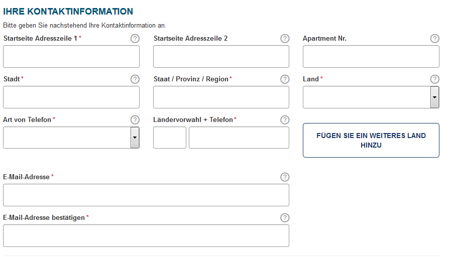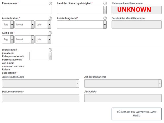 Der Buchstabe O wird bei Passnummern Deutchland, Österreich und der Schweiz nicht genutzt, es handelt sich also immer um die Ziffer 0. In das Feld ‘Nationale und persönliche Identitätsnummer ‚Unknown‘ eintragen, da es sie in Deutchland, Österreich und der Schweiz nicht gibt. Falls Sie einen Pass eines anderes Landes haben, klicken Sie ‘Fügen Sie anderes Land hinzu‘